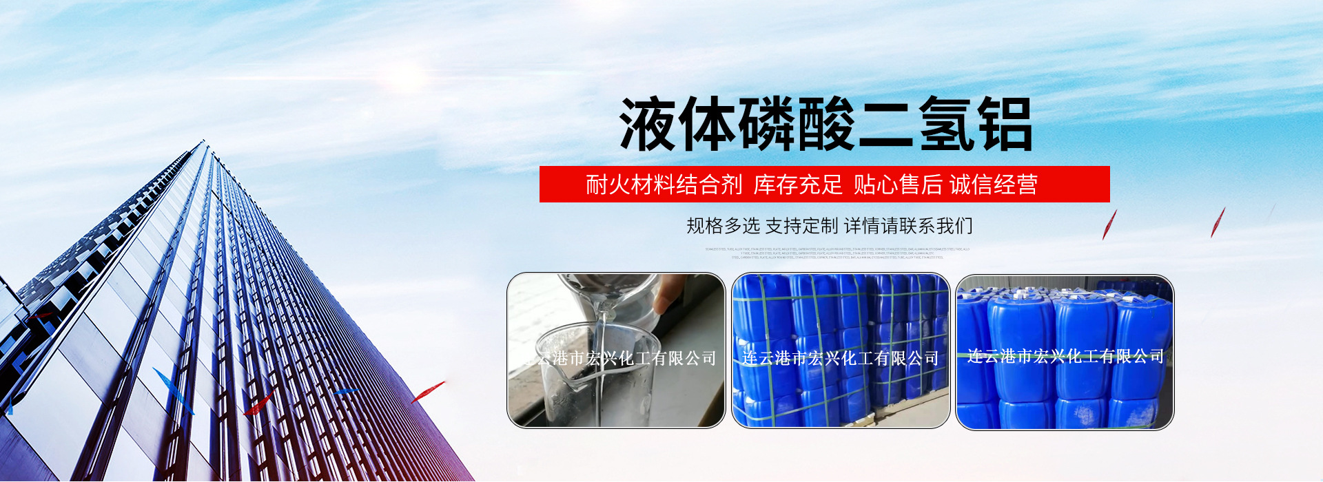 連云港市宏興化工有限公司成立于2008年,十余年來致力于化工產(chǎn)品技術(shù)開發(fā),為客戶量身打造適合的產(chǎn)品,公司磷酸二氫鋁產(chǎn)品采用高純?cè)仙a(chǎn),無色透明,無任何雜質(zhì),質(zhì)量持久穩(wěn)定,公司與江蘇、河南、山東等眾多耐火、涂料等企業(yè)保持長(zhǎng)期合作關(guān)系,誠(chéng)信經(jīng)營(yíng)、物優(yōu)價(jià)廉是我們的服務(wù)宗旨,宏興化工期待與您合作!!